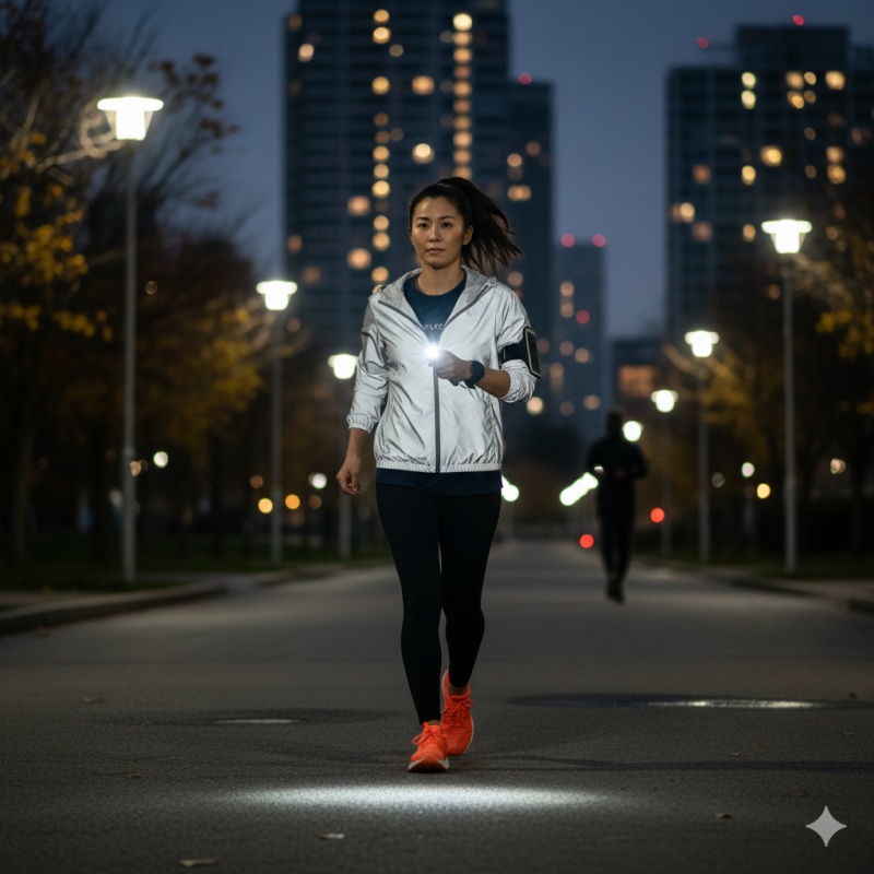 夜間のウォーキングでは、交通事故や防犯上のリスクが高まります。反射材のついたウェアを着用したり、明るい色の服を選んだり、防犯ブザーやスマートフォンを持って出かけるなど、安全対策を徹底してください。